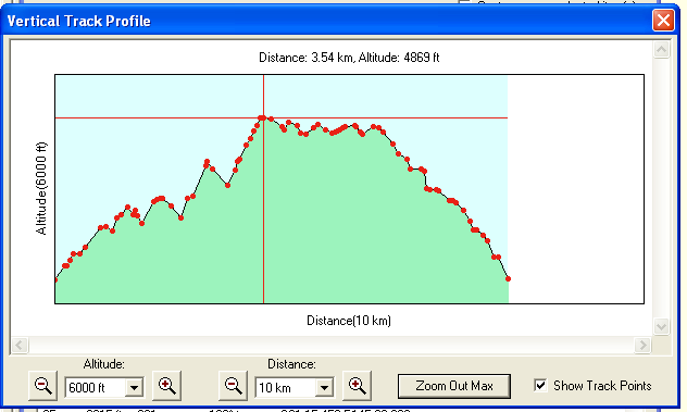 Above is an altitude profile as displayed by the Garmin Mapsource program. The red dots represent track points where the garmin unit takes a positional snapshot. The interval is controlled to preserve battery life and memory. This data is transfered via serial cable to laptop to save and display.