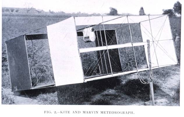 Late in the 19th century, a US weather station box kite, a derivative of The Hargraves Box Kite. A meteorograph is between the cells, top centre and it measures and records barometric pressure then transfers to a rolling graph paper with ink pens. Trains of these kites regularly flew over 10,000 ft.